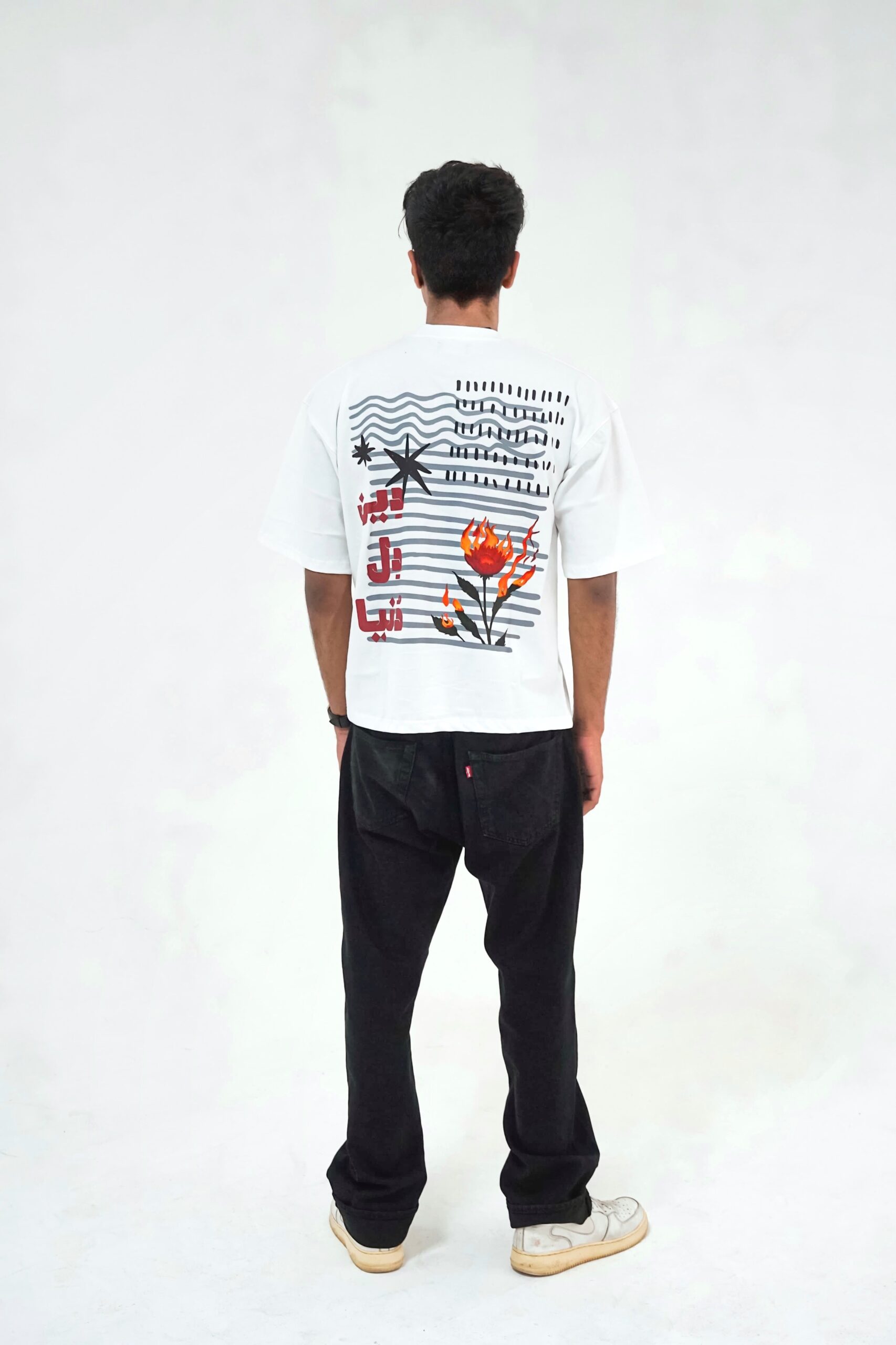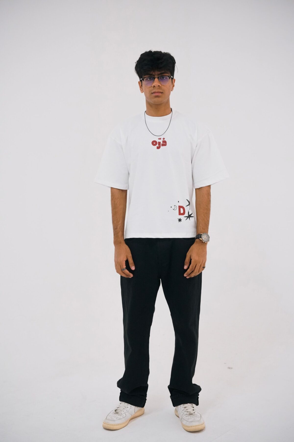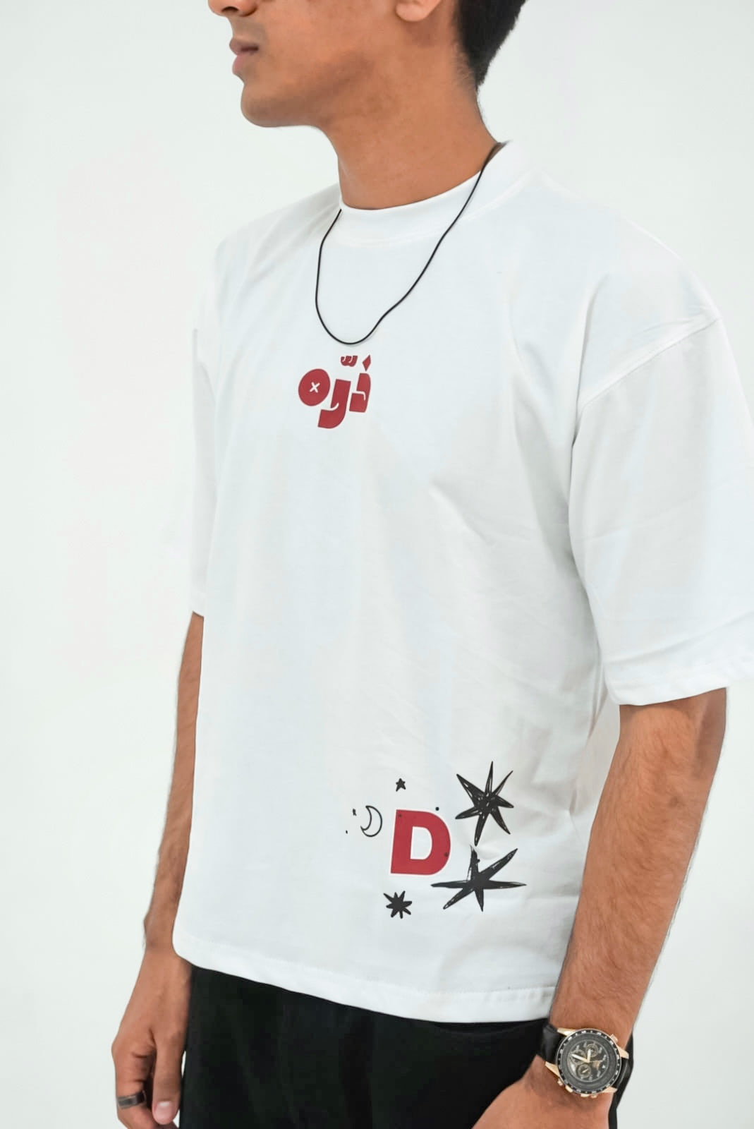 Oversized white tee combining the best of both worlds: vibrant DTF and bold screen printing. Crafted from 200 GSM cotton jersey, it offers a relaxed fit with drop shoulders and a classic crew neck. The mixed-media print adds a unique, tactile dimension to your everyday look.