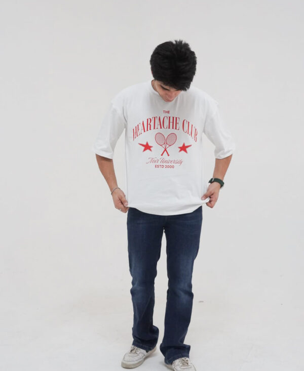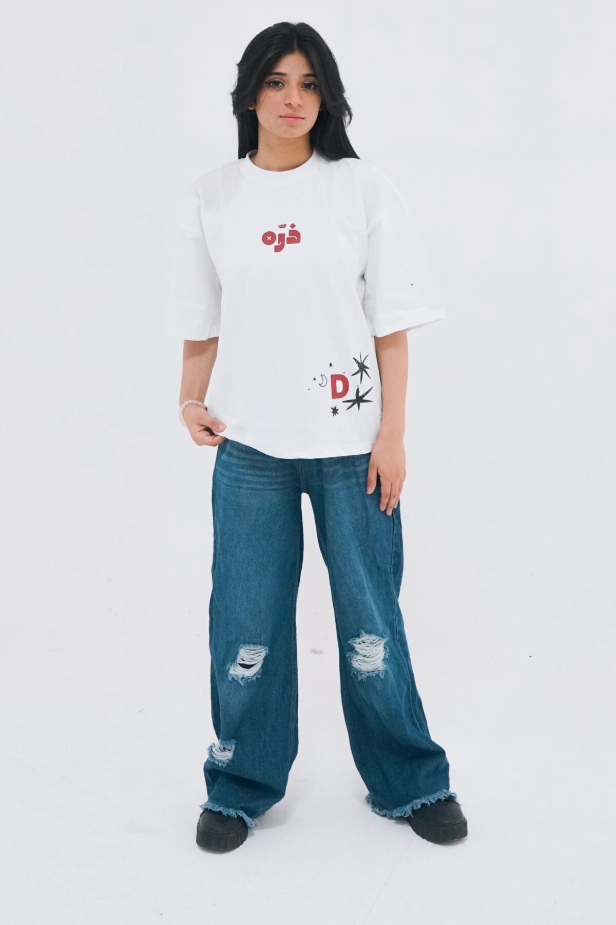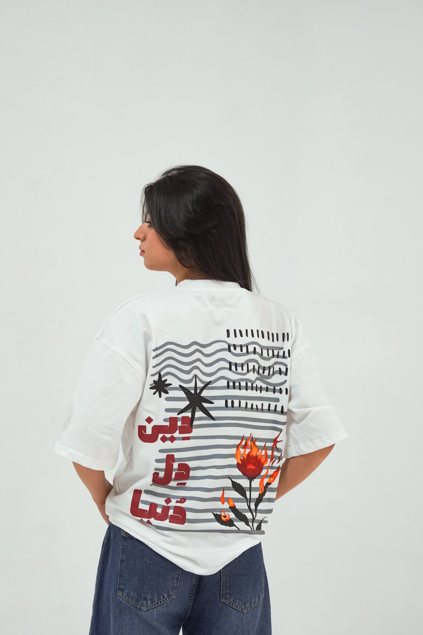 Oversized white tee combining the best of both worlds: vibrant DTF and bold screen printing. Crafted from 200 GSM cotton jersey, it offers a relaxed fit with drop shoulders and a classic crew neck. The mixed-media print adds a unique, tactile dimension to your everyday look.