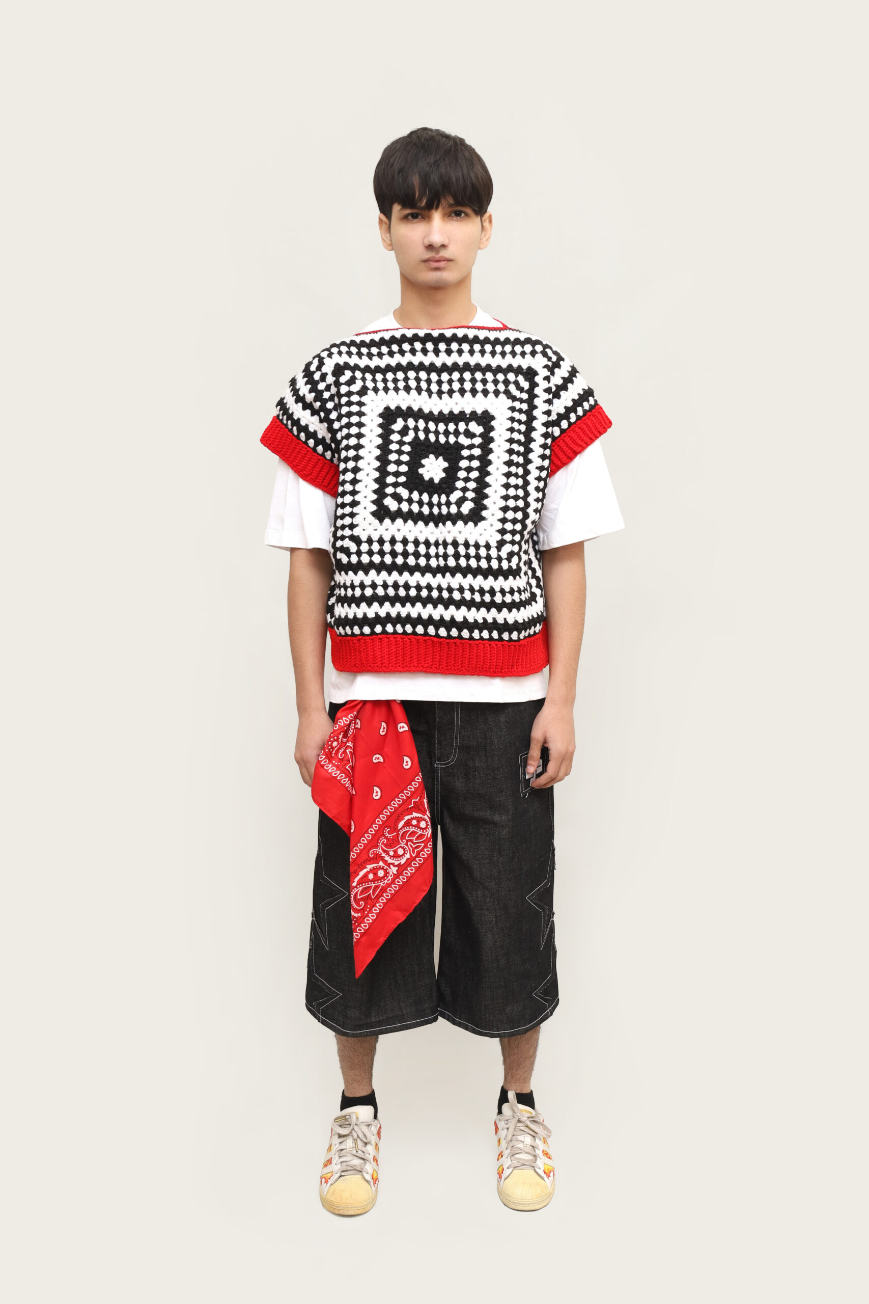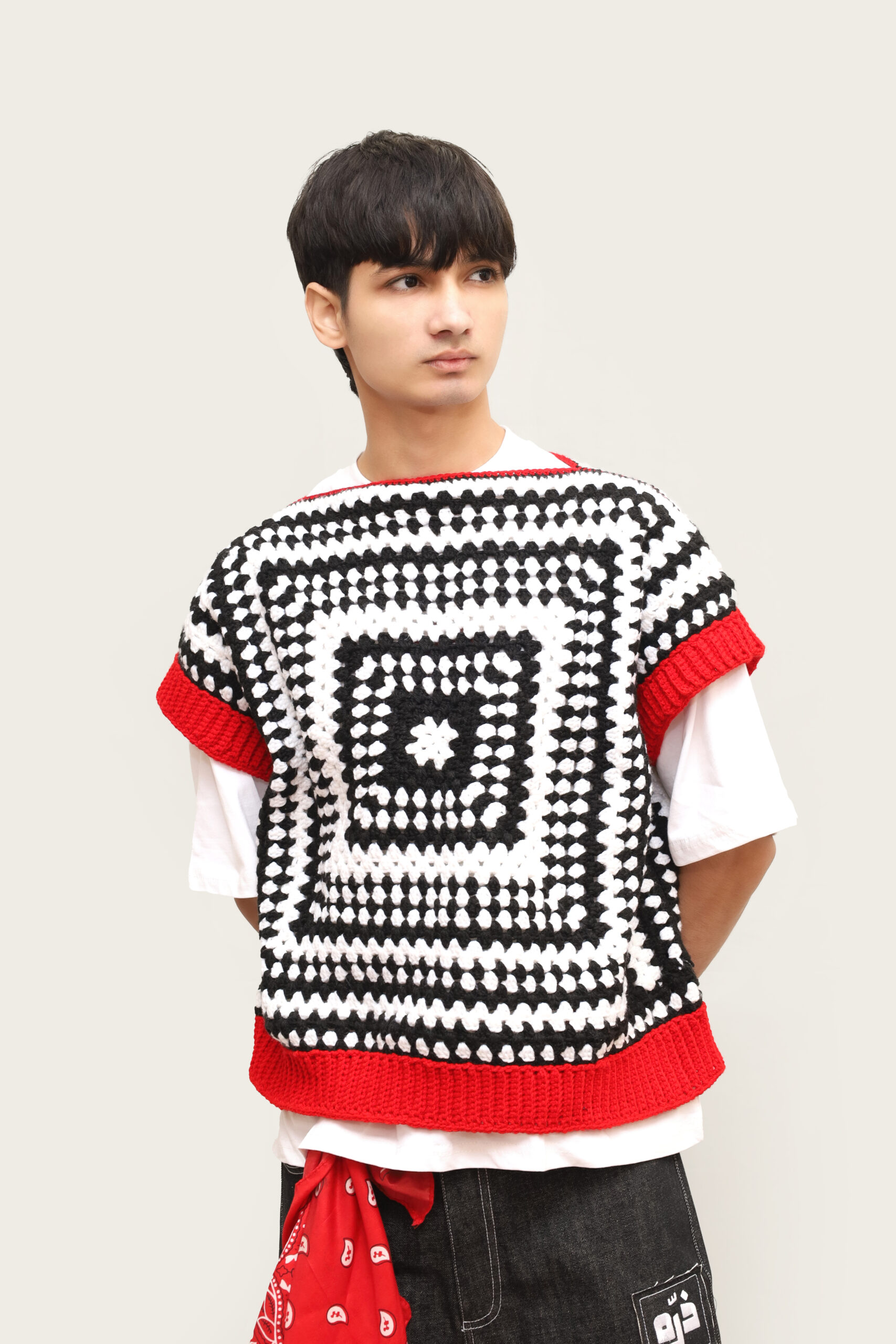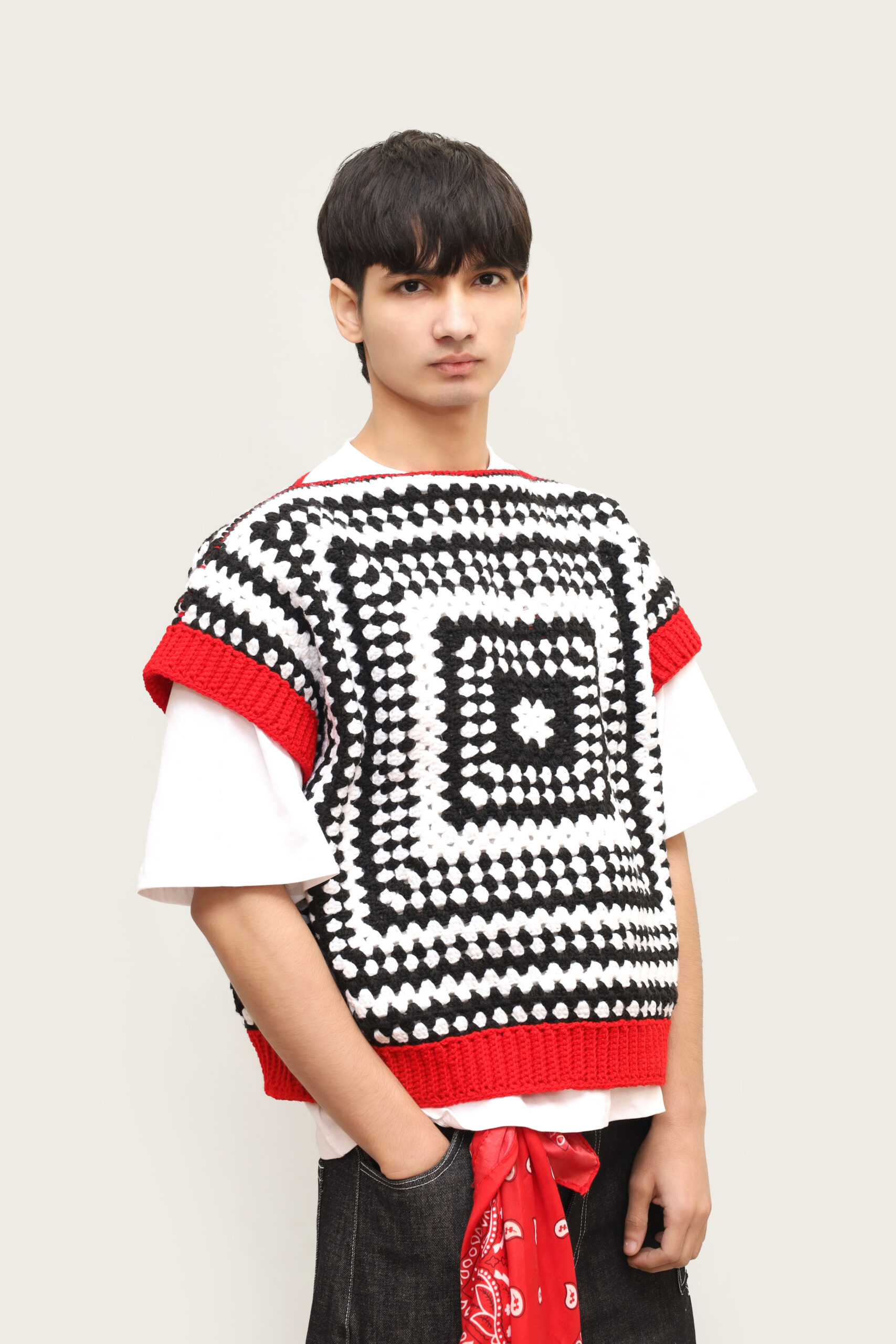 A handcrafted crochet vest featuring a bold black and white geometric pattern with contrast ribbed detailing and a relaxed fit.A statement piece that blends craftsmanship with everyday wearability.