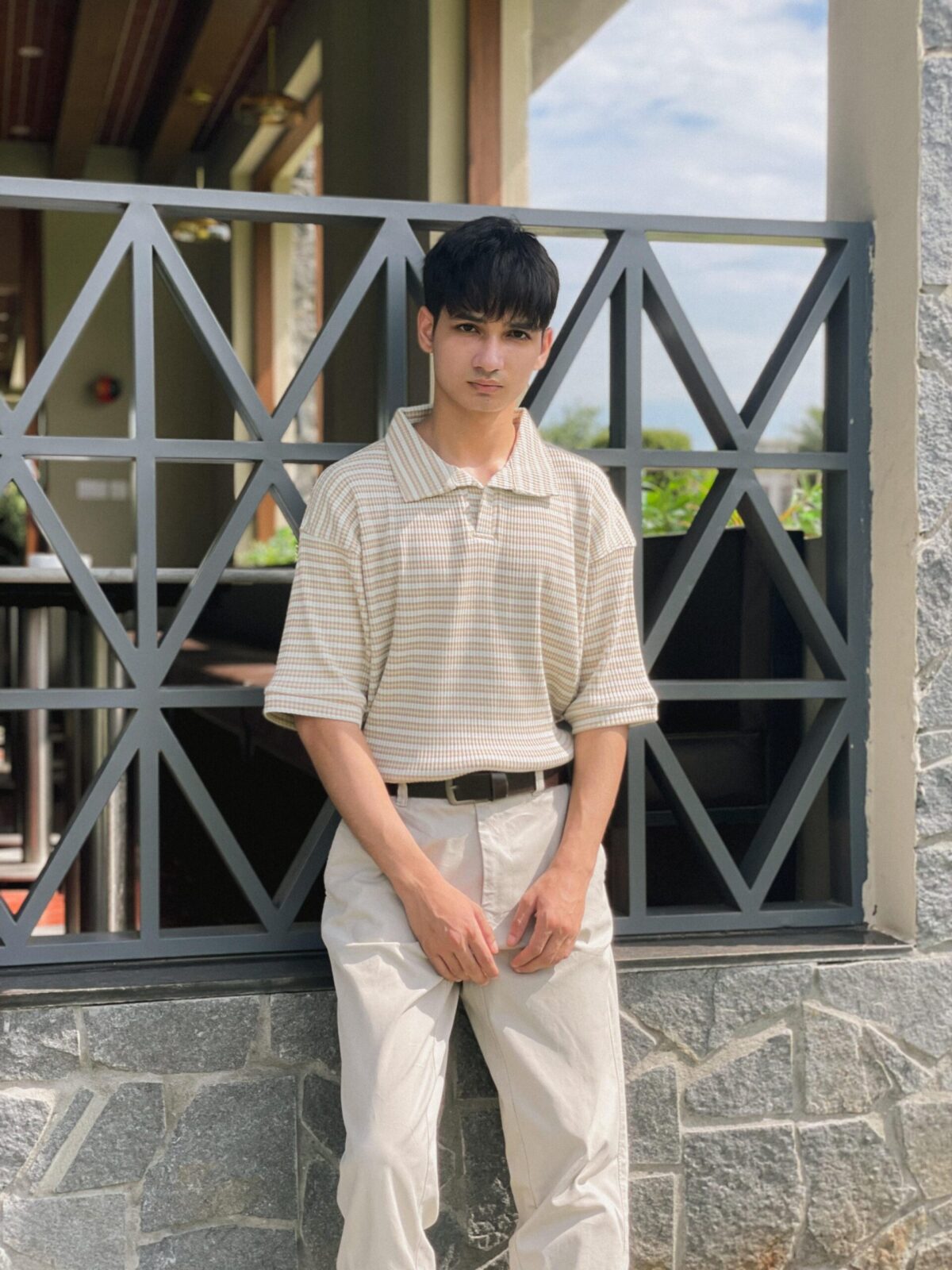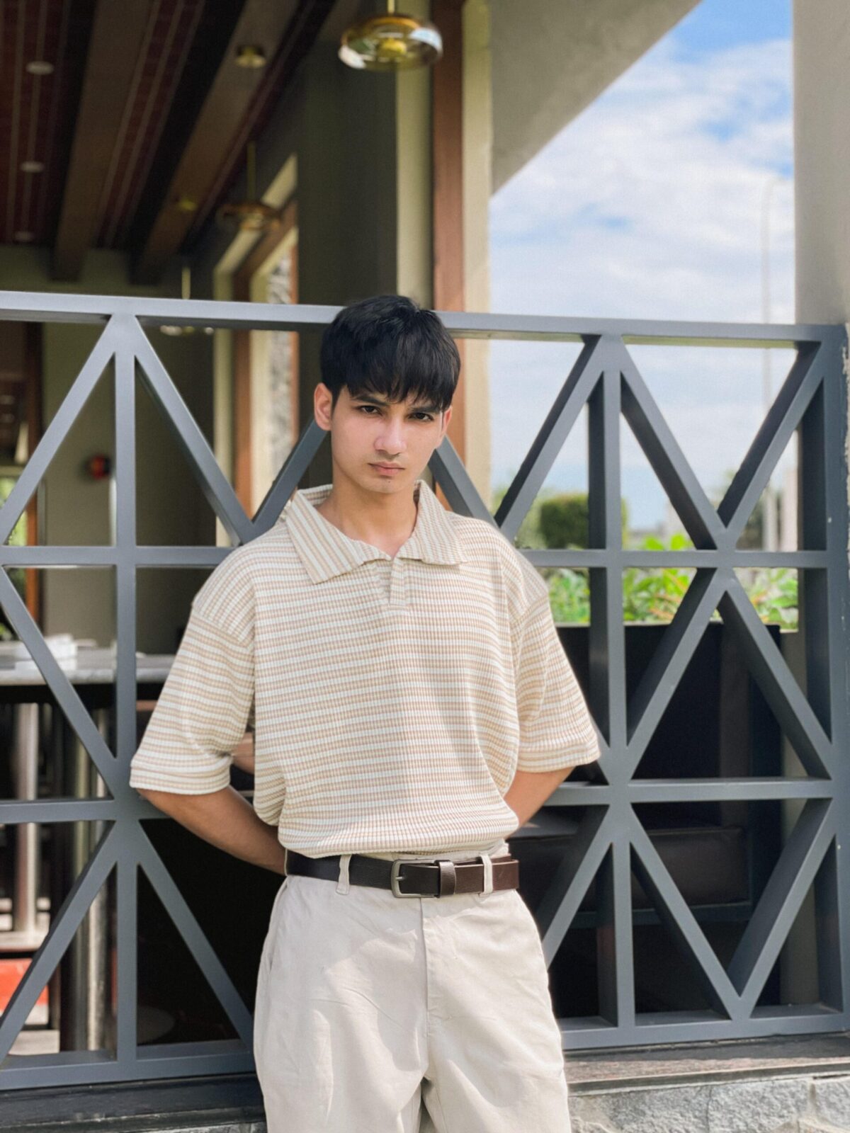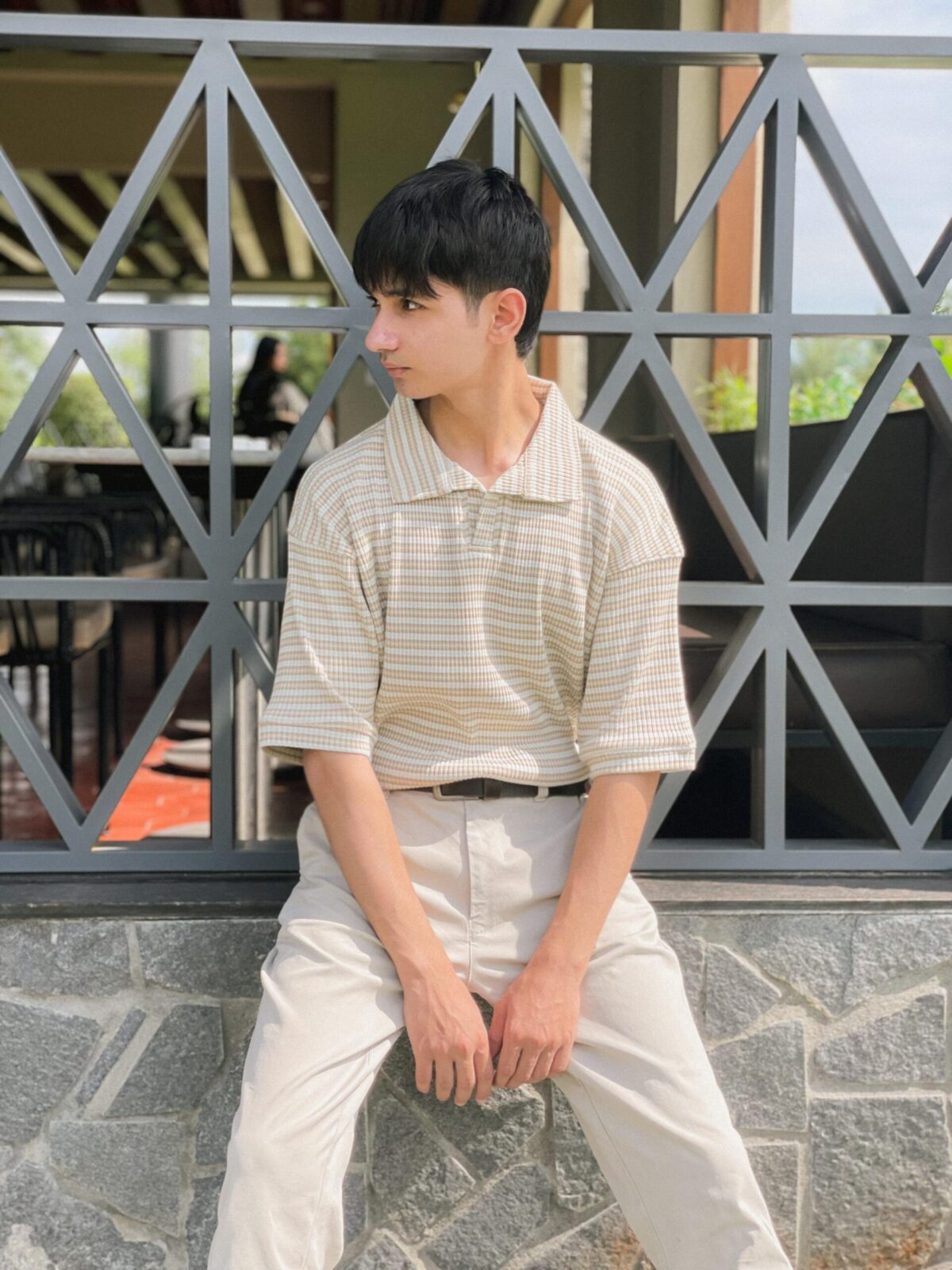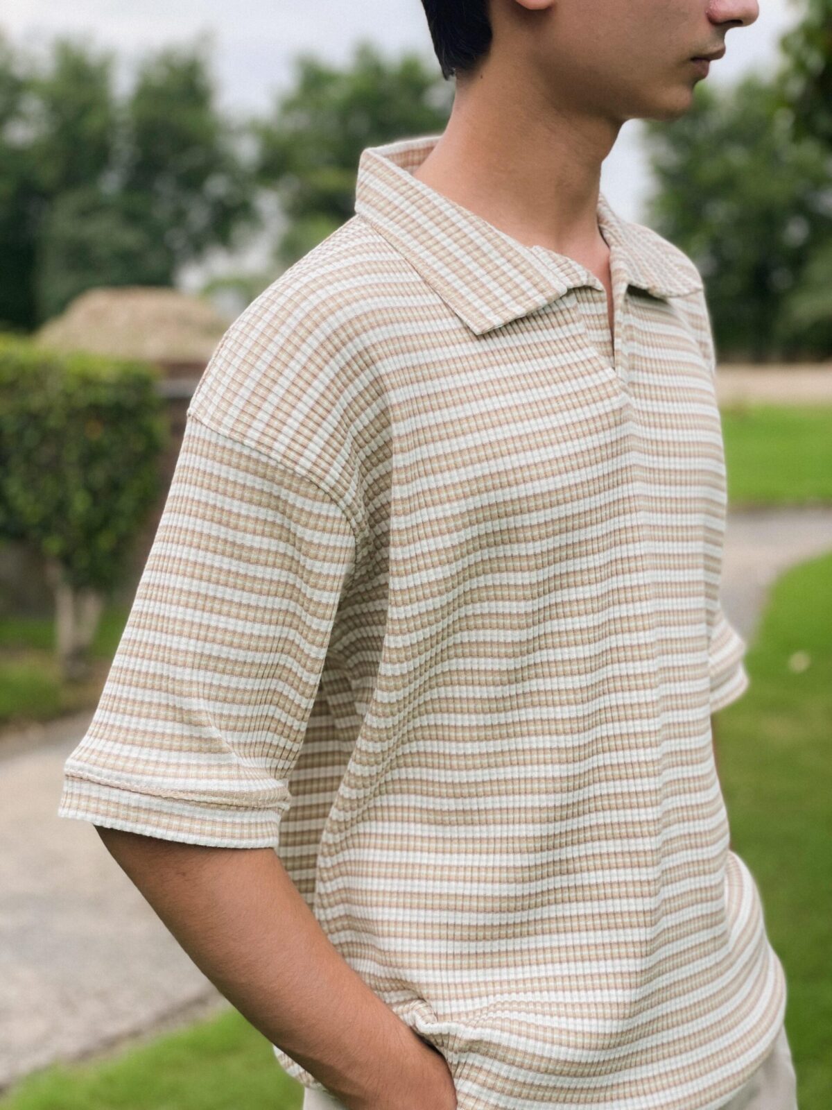 Made from a soft ribbed knit, this polo features warm beige and white checks for a relaxed yet refined look. Its breathable texture and easy fit keep you comfortable, while the classic collar adds a touch of polish.
